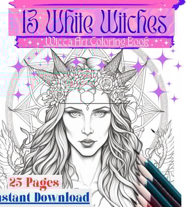 13 White Witches Wicca Art Coloring Book is captivating for children and adults alike. Each page celebrates an historic and legendary white witch (good witch), and is adorned with intricate artistic symbolism that weaves together spirituality and the beauty of nature’s magic. From flowing robes adorned with celestial motifs to alchemical and cultural symbols, the artwork invites colorists to bring these powerful figures to life. A wonderful alternative the usual and unsavory gore of Halloween.